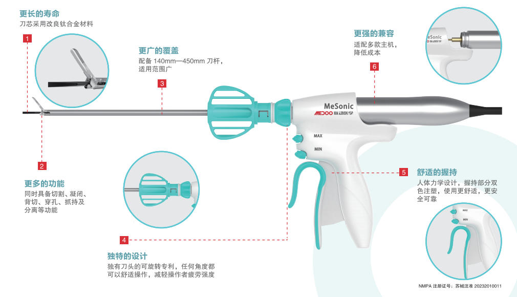 超声刀具金称为"起声切割止血刀",是临床外科的新型手术设备。切割精确,烟雾量少,热损伤小。广泛应用于腔镜、单孔腔镜、开放、浅表、机器人等手术。