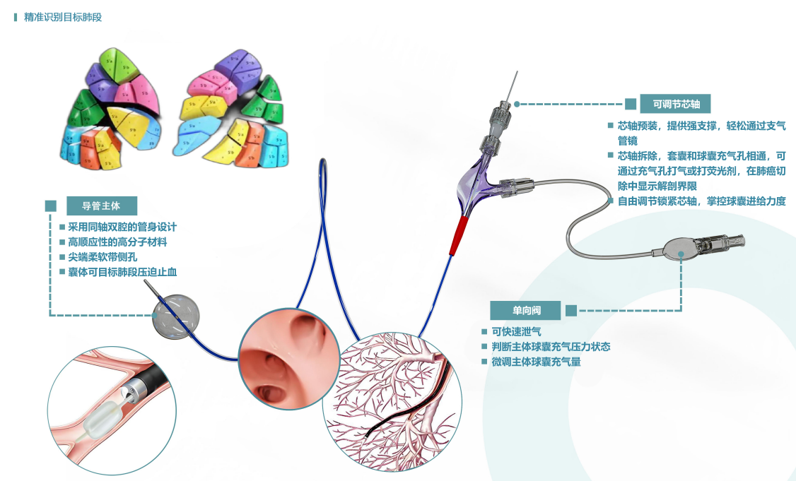 深圳脉腾携手中国医学科学院肿瘤医院(国家肿瘤中心),隆重推出创新的可进入肺段的支气管封堵导管产品(NMPA注册证:粤械注准20242081467)。在支气管镜引导下精确进入目标肺段或亚肺段,通过套囊充气封堵,并借助导管内独立通道向目标肺段充气,使其选择性膨胀,更好的确定肺段解剖界限。