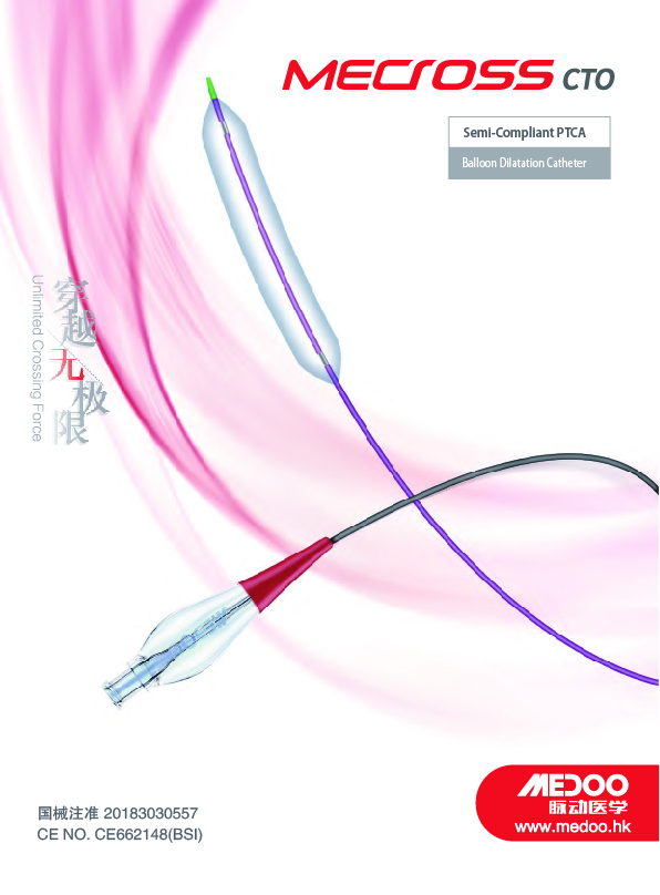 MeCross CTO(快速交换)半顺应性预扩球囊导管是脉动MeCross(商标:脉腾)家族中针对血管全闭塞及其它慢性狭窄病变而设计的高品质预扩球囊导管。其中国注册证号为20183030557,欧盟注册证号CE662148。MeCross CTO在设计与材料的选择上进行显著的革新,具备优秀的穿越病变的能力、安全可靠。