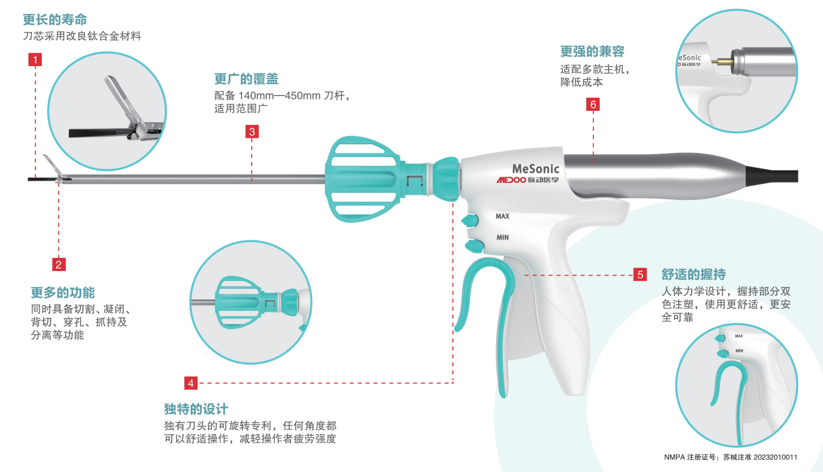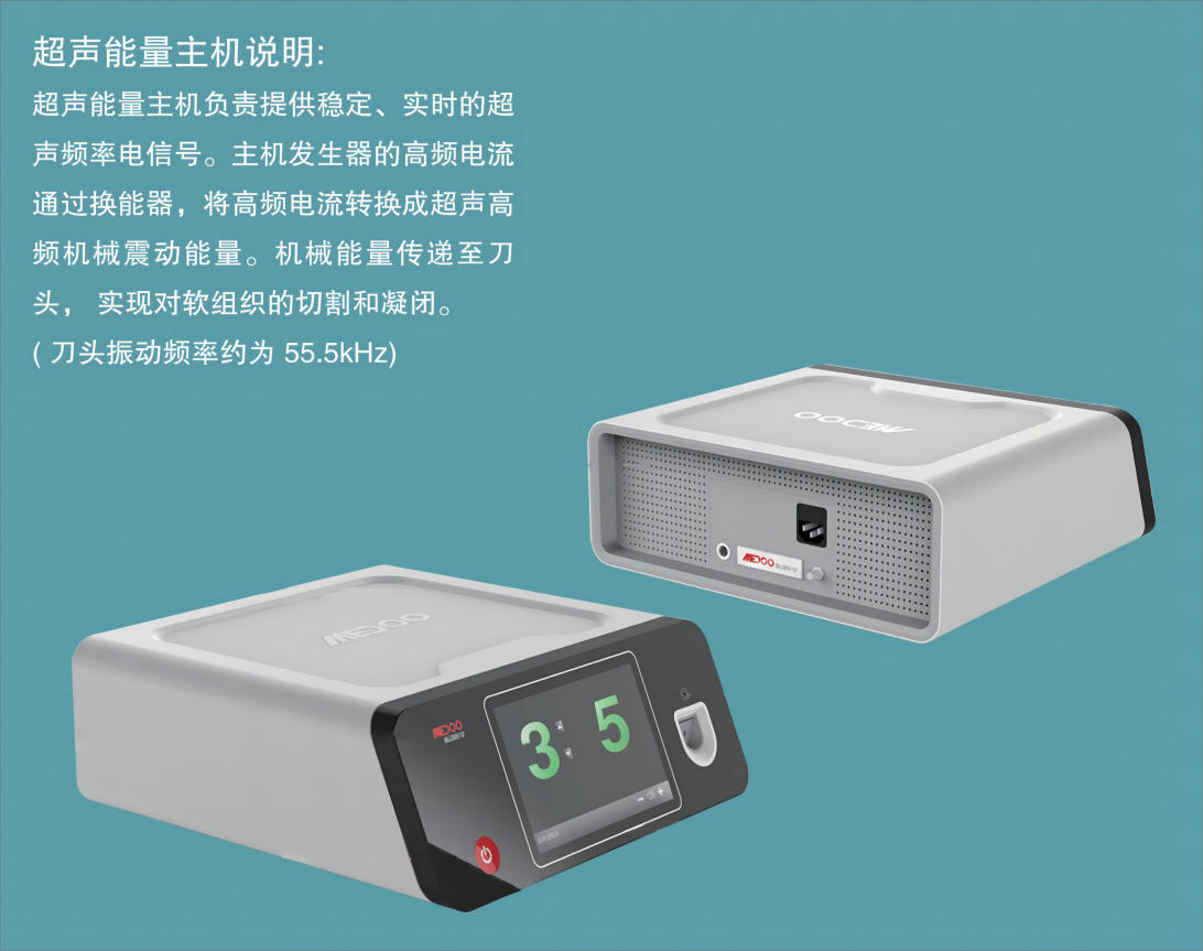 超声能量系统将电能经手柄转化为超声机械能,使刀头在超高的振动频率(55,500次/秒)下接触组织蛋白,产生空化作用,迅速令组织内水分汽化,蛋白氢键断裂,蛋白质变性成为粘性凝结物,从而达到切割、凝闭组织和止血的作用。