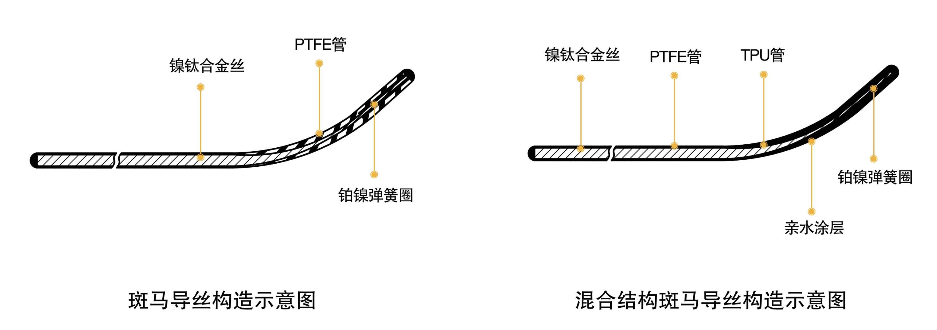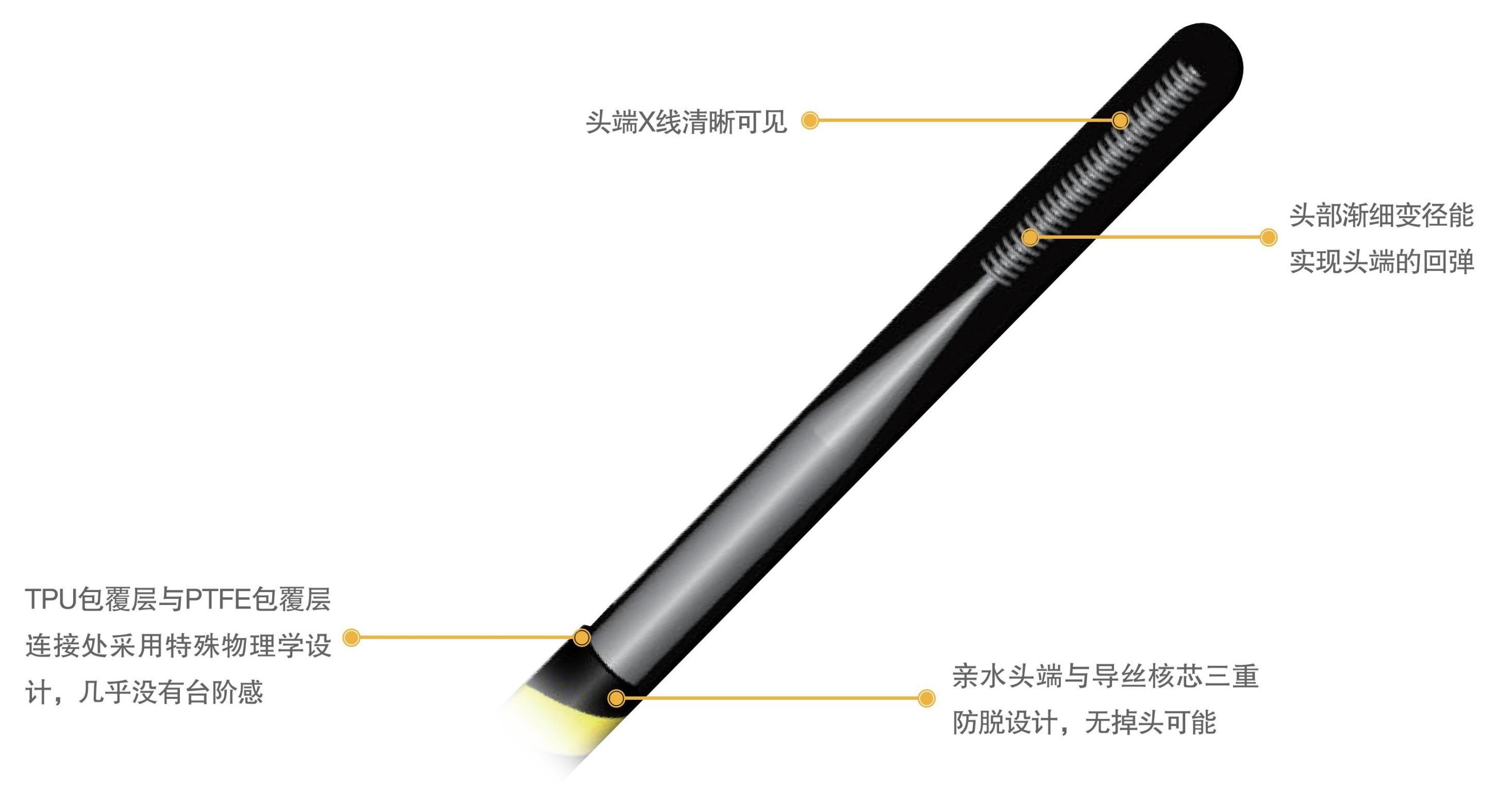 斑马导丝也称为非血管腔道导丝,它由导丝杆、弹簧软头及包塑层等组成。按弹簧软头不同和是否包塑分为大头硬导丝、平头硬导丝和包塑导丝,按导丝杆尺寸不同分为若干规格。斑马导丝具有良好的柔韧性,不易产生折曲,PTFE包塑层润滑性好,可通过性强。