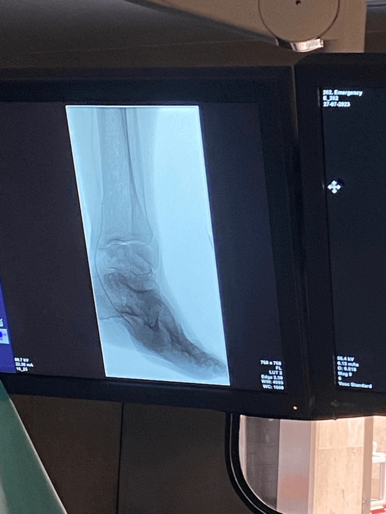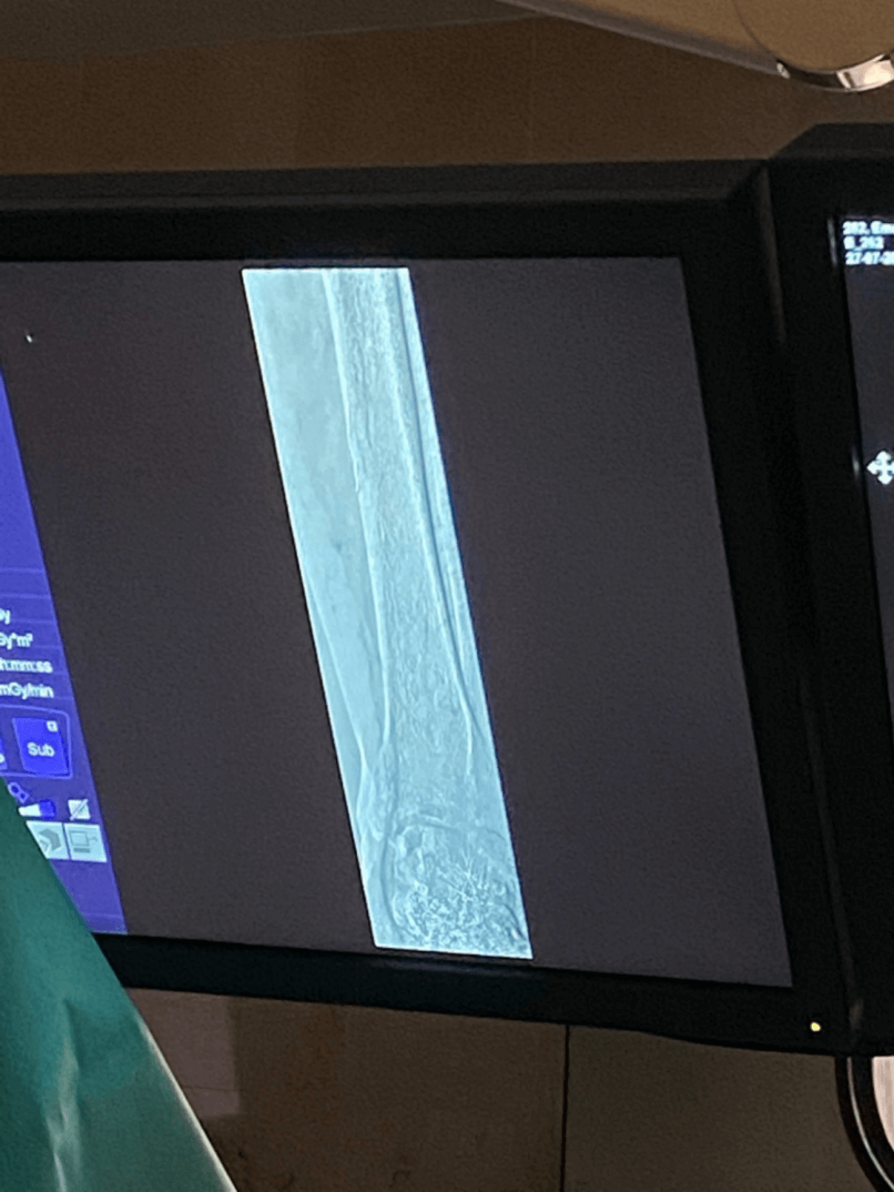 70岁,糖尿病患者,不吸烟,饮酒。此前在股浅动脉(SFA)放置过两个重叠的支架,80-120段出现30%的再狭窄。膝窝动脉(POP)轻度钙化,胫腓动脉干(TPT)长段弥漫性钙化。前胫动脉(ATA)不畅,患者的腓动脉与胫后动脉(PTA)均有病变。
