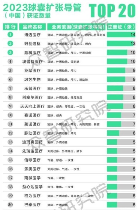 脉动医学于2023年球囊扩张导管(中国)获证数量位列TOP 20。