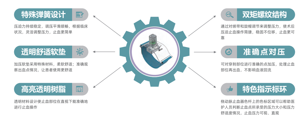 采用旋钮式加压方式压迫止血,灵活细微调控压迫力度,以满足不同的临床需要环氧乙烷灭菌,一次性使用