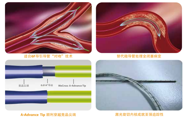 MeCross CTO球囊导管采用了低轴杆外径,有利于临床医生在2毫米(6F)指引导管中同时通过2个球囊导管,做对吻手术。独特的A-Advance Tip尖端设计保证了产品的通过性能。同时,全新的超润滑S-Coating亲水涂层也有助于减少轴杆摩擦力,进一步增强了产品的通过性能。采用“无缝“力传导技术,提供充沛的推送力。MeCross CTO可顺利通过狭窄病变,处理临床治疗中CTO伴钙化病变等问题。MeCross CTO涵盖1.0mm至4.0mm的各种尺寸,可适应几乎所有心血管介入术的预扩应用需求。