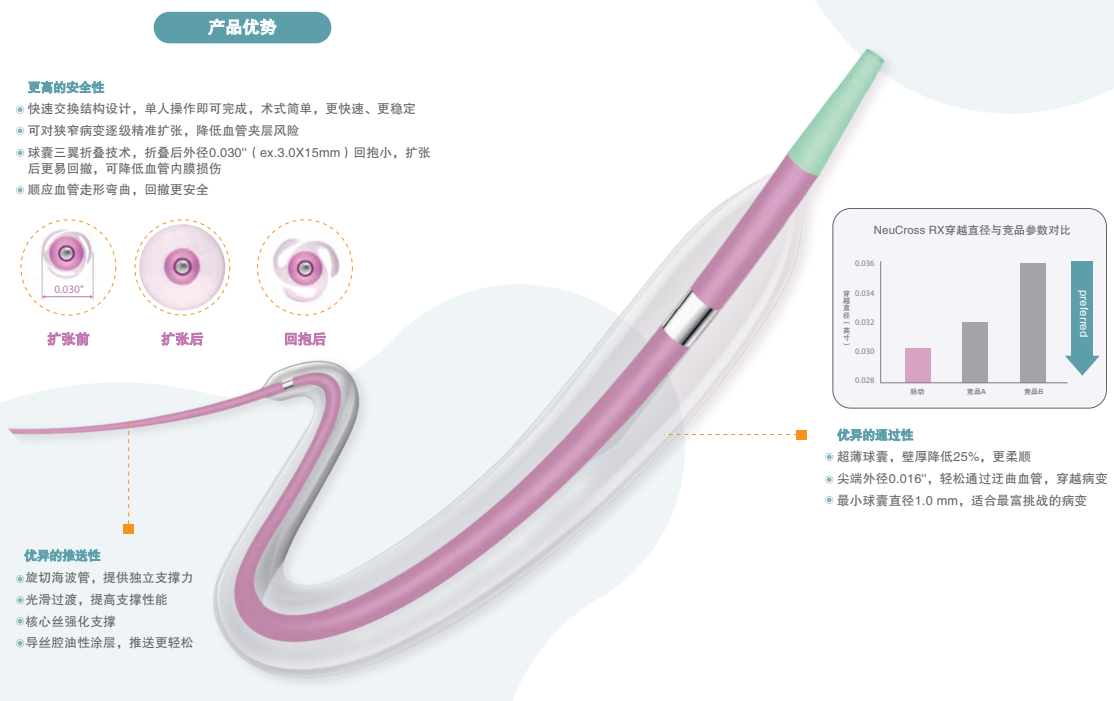 NeuCross RX具备更高的安全性、优异的推送性及通过性。在设计与材料上,脉动医学进行突破性革新。独特的A-Advance尖端可快速切入病变,超滑S-Coating外涂层和内硅油双涂层使手术游刃有余,折叠外径小通过性能卓越,无缝过渡衔接技术提供充沛的推送力;具备48种型号(最小球囊直径1.0mm),规格更全,可供临床更多选择,深受专家好评。
